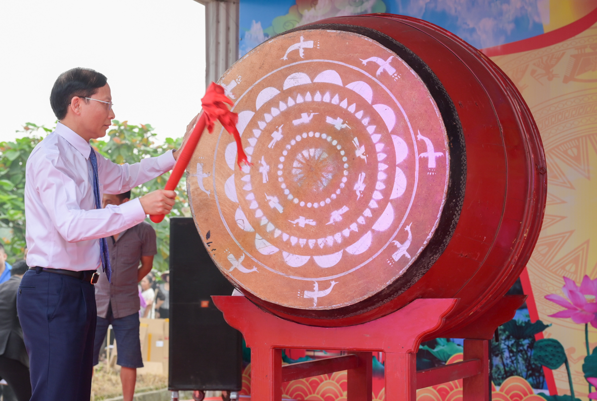 Đồng chí Bí thư Đảng uỷ Mai Hồng Hà đánh trống khai hội.