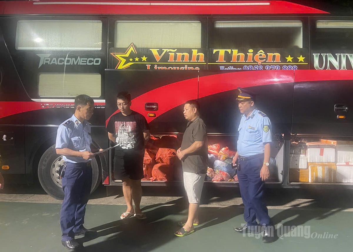 Lực lượng chức năng kiểm tra chủ phương tiện xe ô tô khách vận chuyển số hàng hóa vi phạm. |