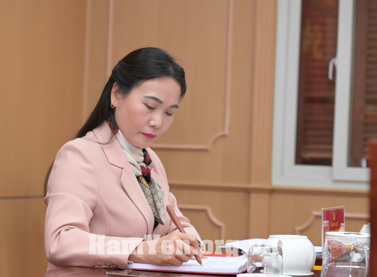 Đồng chí Nông Thị Bích Huệ, Ủy viên Ban Thường vụ Tỉnh ủy, Phó Bí thư Thường trực Chuyên trách Đảng ủy UBND tỉnh Tuyên Quang ghi nhận các ý kiến tại buổi làm việc.