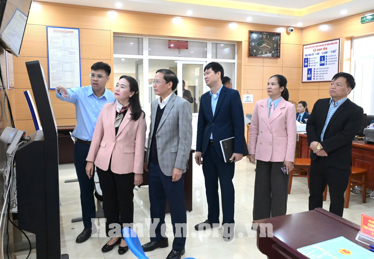 Trước buổi làm việc, đồng chí Nông Thị Bích Huệ, Ủy viên Ban Thường vụ Tỉnh ủy, Phó Bí thư Thường trực Chuyên trách Đảng ủy UBND tỉnh Tuyên Quang cùng đoàn công tác đến thăm, kiểm tra hoạt động tại Trung tâm Phục vụ hành chính công xã Hàm Yên.