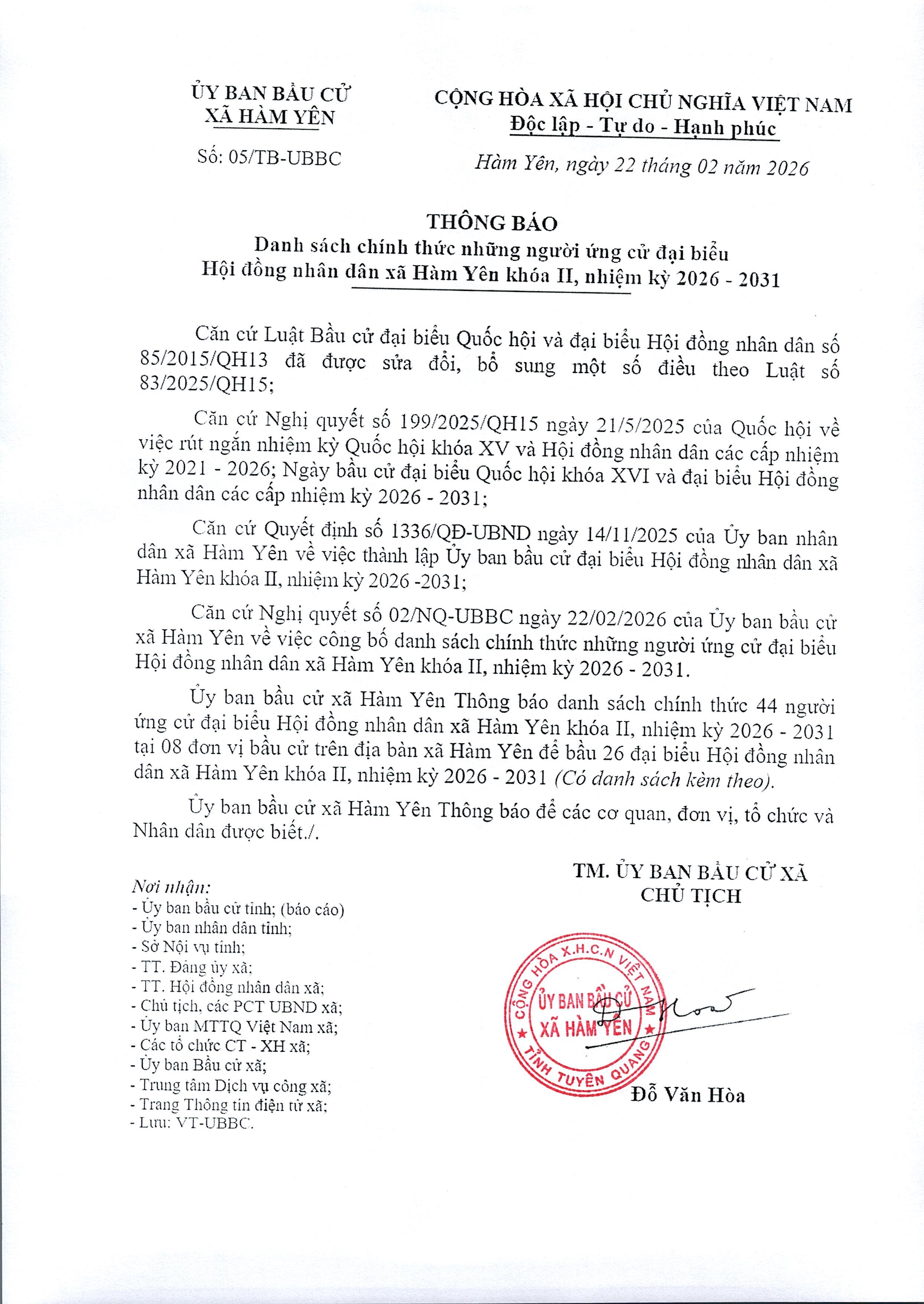 Thông báo danh sách chính thức những người ứng cử đại biểu Hội đồng nhân dân xâ Hàm Yên khóa II, nhiêm kỳ 2026 - 2031